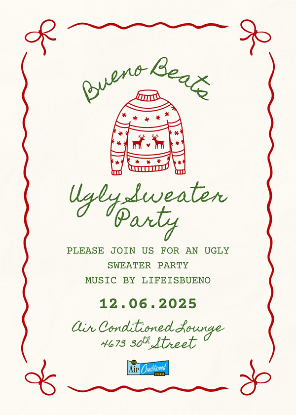 “IT’S BEGINNING TO LOOK A LOT LIKE CHRISTMAS.” This Wednesday, come hang out and meet other local Burners at our monthly SD BURNER MEET UP! THURSDAY, come hang out and check out GENRE FLUID’s The ART CONDITIONED LOUNGE, with Music, Art, Cocktails and more!!! We are back on FRIDAY, so join us as the AC transforms into the always unforgettable night of house music at HOUSE MUSIC FRIDAYS, where you can experience the finest House Beats in San Diego. SATURDAY NIGHT Get your favorite UGLY CHRISTMAS SWEATER on and dance all night with BUENO BEATS!! To keep up with the holiday rush, join us for a special SUNDAY FUNDAY FROM 4-8 PM with amazing DJs and Celebrate December Birthdays!!